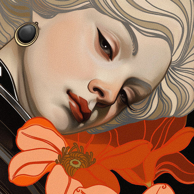 Inspired by Greek mythology and the story of Daphne, the nymph who turned into a laurel tree to escape Apollo. I love how the composition blends neo-traditional style with touches of Art Nouveau, using a palette of orange and black tones that gives it an elegant and melancholic feel.